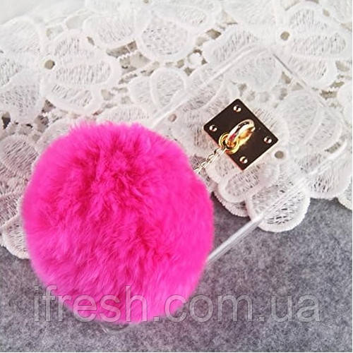 Це прозорий чохол з металевою вставкою під золото, на яку кріпиться пухнаста підвіска з хутра кролика та китиця з бахромою.