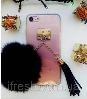 Це прозорий чохол з металевою вставкою під золото, на яку кріпиться пухнаста підвіска з хутра кролика та китиця з бахромою.